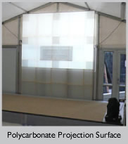 The three timber frames are clad in a translucent twin wall polycarbonate to provide a surface to light through and project on. |