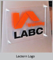 Vinyl letters and a logo have been cut out and applied to a sheet of clear acrylic mounted onto a conference lectern |