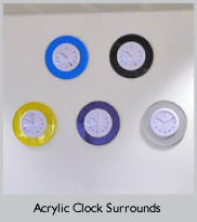 The five clock surrounds were created by router cutting circles from 25mm thick acrylic, polishing the edges to provide a clear, smooth finish, and applying different coloured vinyl to the reverse face. |